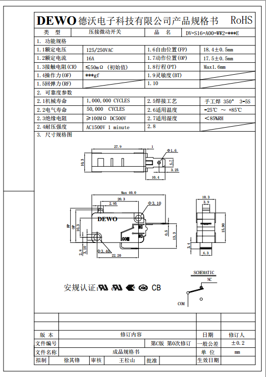 DV-16-A00-WW2-200E型微動(dòng)開關(guān)